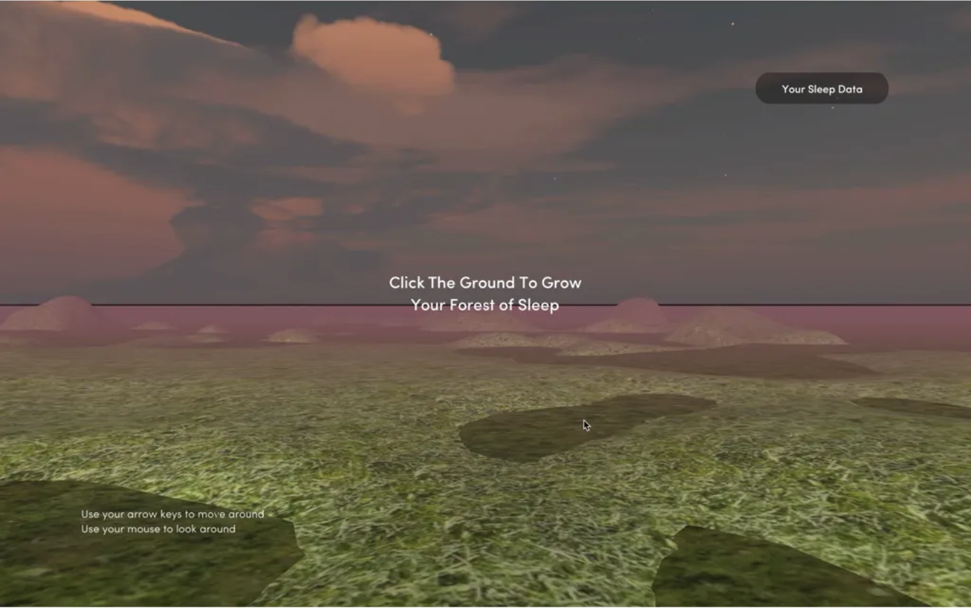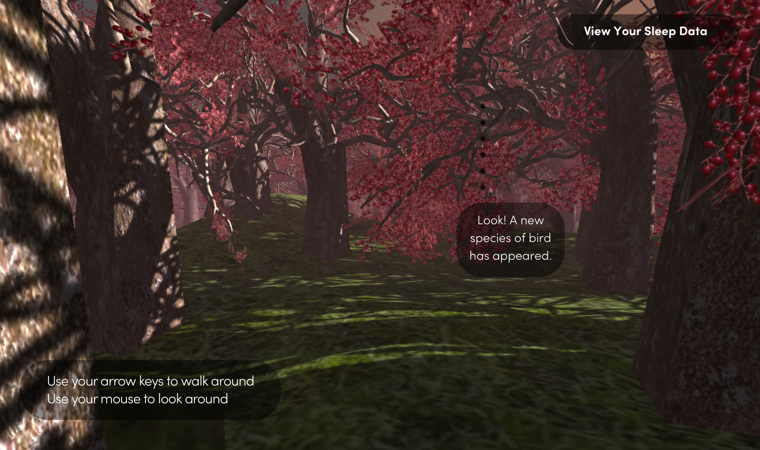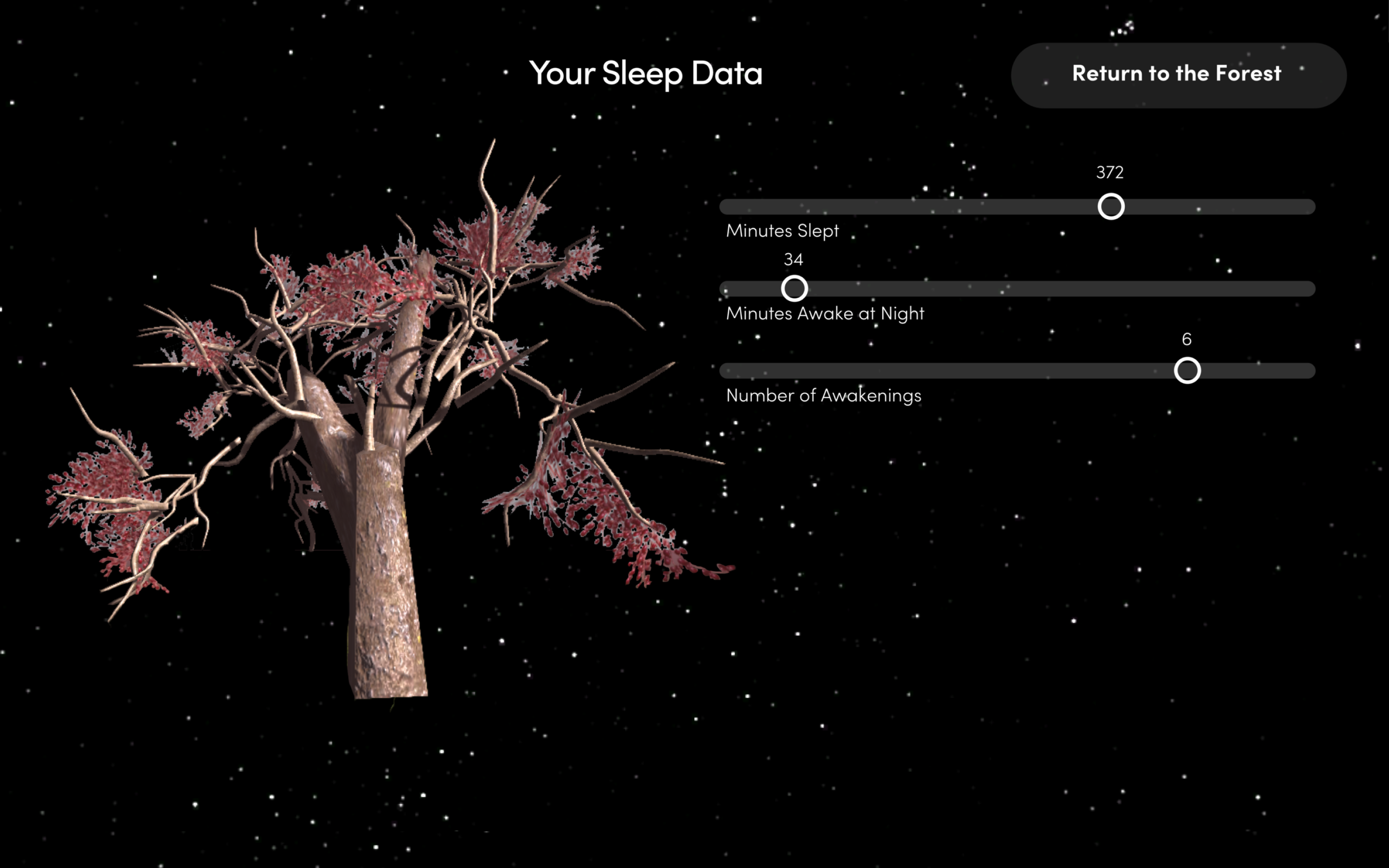 Enter your forest to see and move around the trees generated by your sleep data from the past week, taken from your Fitbit. Continued use and the input of more qualitative data surrounding your sleep, such as adherence to routines or abstaining from things that will negatively impact your sleep, like coffee, generate new environmental aspects for your forest, like sound, and other forms of life like birds or new plants.